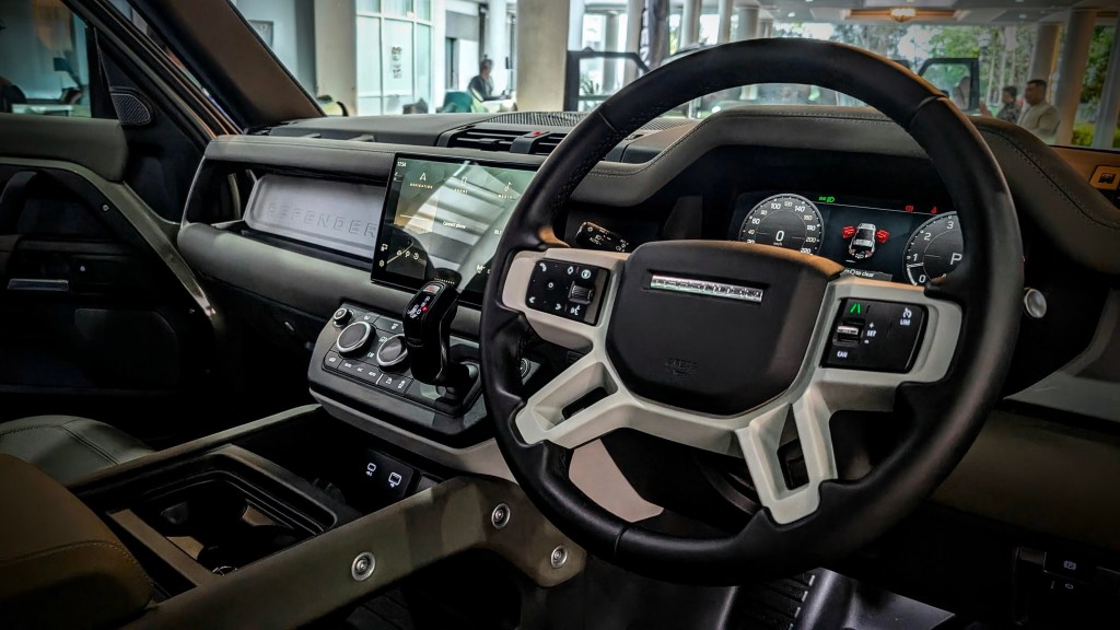 Inside, a new 13.1-inch touchscreen for the infotainment system brings all of Defender’s technology highlights to the front-row occupants via a larger display, above the ergonomically repositioned dash-mounted gear shifter.